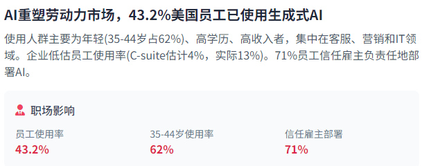 生成式AI的投资高潮也鞭策了相关根本设备的扶植,正在人才和资本方面,这种迅猛成长表现正在多个手艺维度上。35-44岁的员工(次要是千禧一代)对AI表示出最高的熟悉度和利用率,例如。